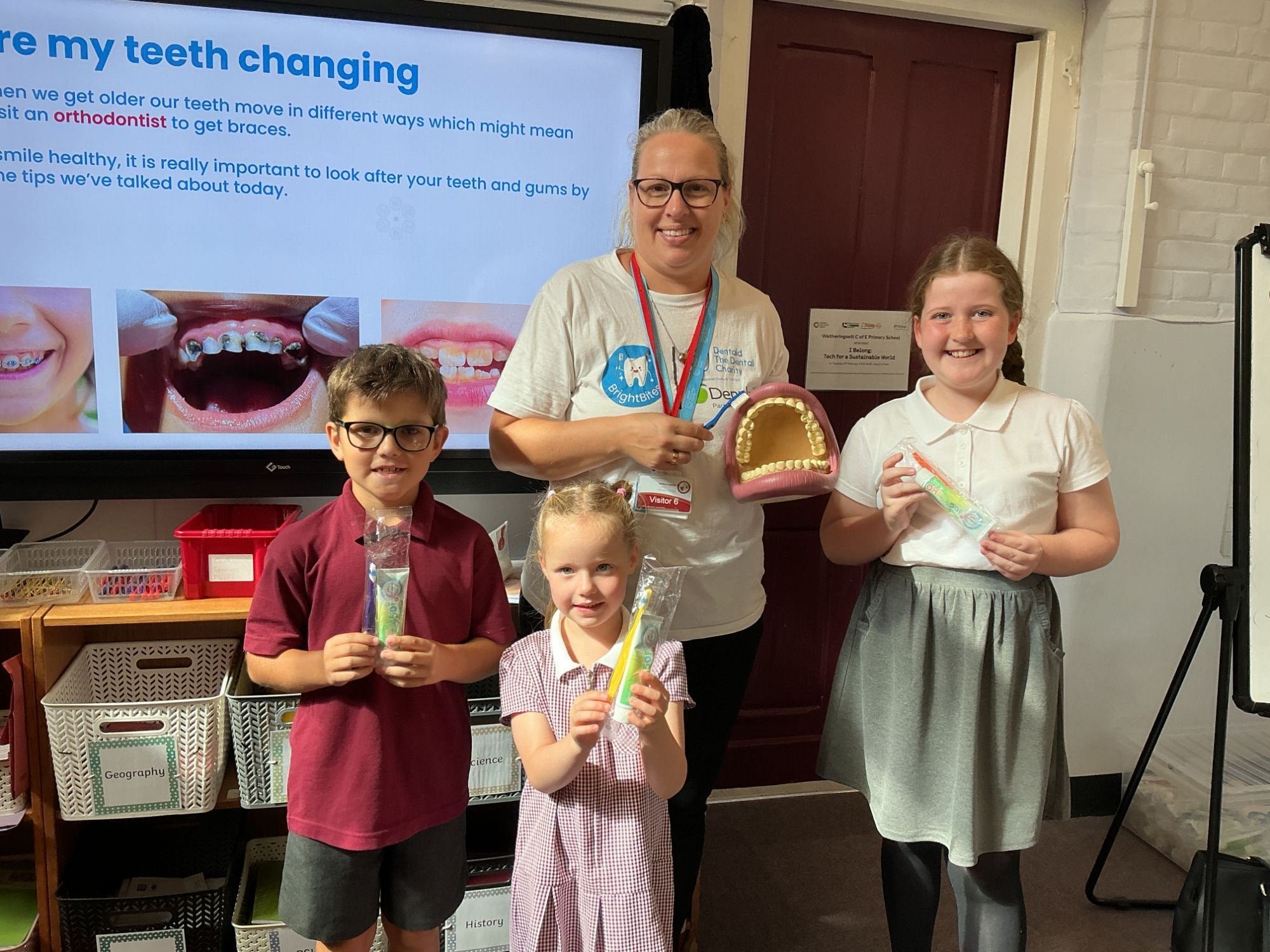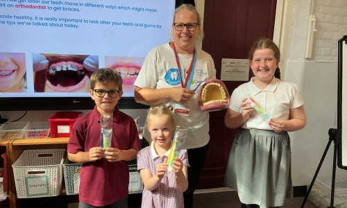 Today we had a different type of collective worship. Sarah from Dentaid- The dental charity, taught the children all about how to keep their teeth healthy. This included advice on brushing techniques and how to ensure a healthy diet. All the children sat beautifully and learnt a huge amount. A big thank you to Sarah for taking the time to come and visit us at our school. Each child will bring home a free toothbrush, toothpaste and an informative leaflet from school today to support their brushing at home.